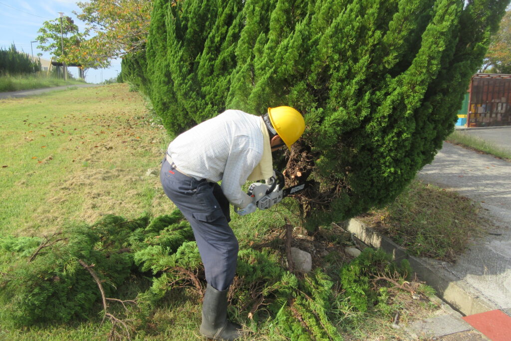 4丁目集会所付近の植え込みを剪定ばさみで、4、5丁目の境のカイズカイブキはチェーンソーで剪定しました。