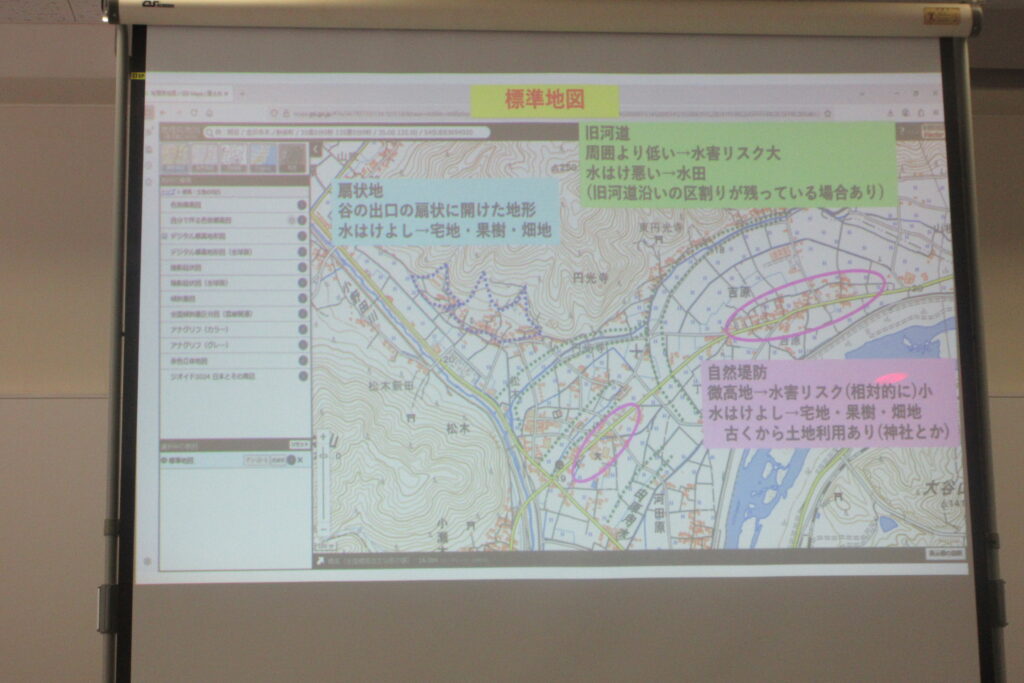 国土地理院の地図を使って、様々な地形(扇状地、自然堤防、旧河道など)が分かることにビックリしました。見慣れた標準地図だけでなく、傾斜量図、陰影起伏図、土地条件図なども出すことができ、地図のイメージが変わりました。
