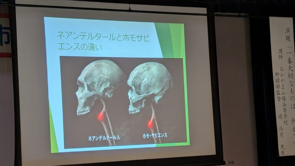 ネアンデルタール人とホモサピエンスの違いは、共感性、集団性にあるということは以前に聞いたことがありましたが、それが咽仏の位置の違いから言葉能力の違い、コミュニケーション能力の違いにあったことは始めてお聞きしました。