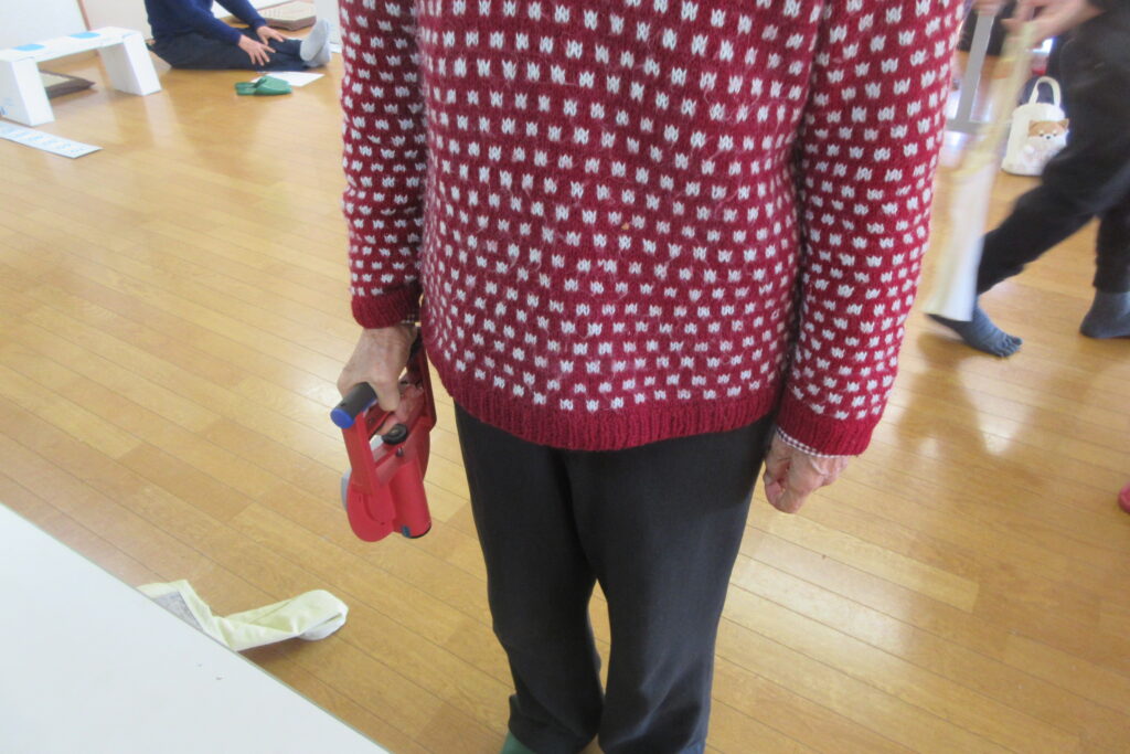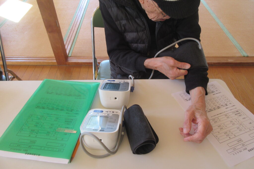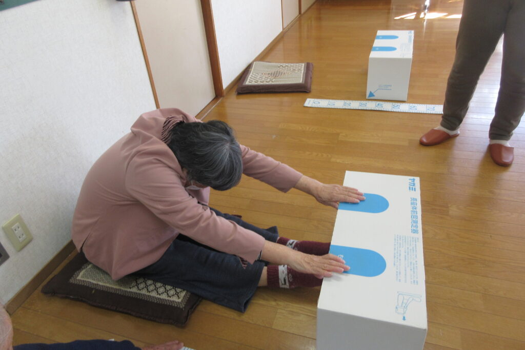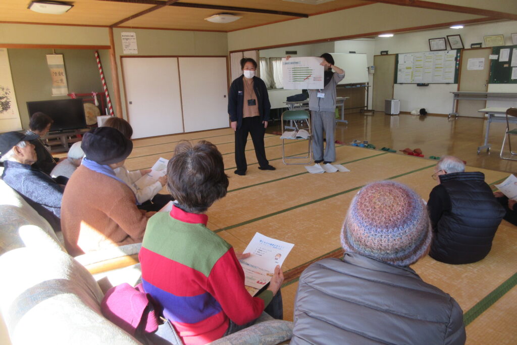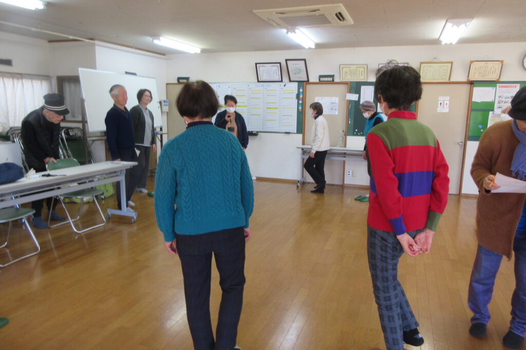 体力測定はいつもの血圧、握力、長座体前屈、開眼片足立ちに加えて、健康増進課から体組成計をお持ちいただき、体脂肪率、筋肉量、体水分量、基礎代謝量などを測って各自の体のチェックをしていただきました。