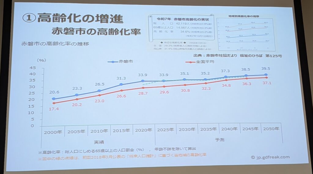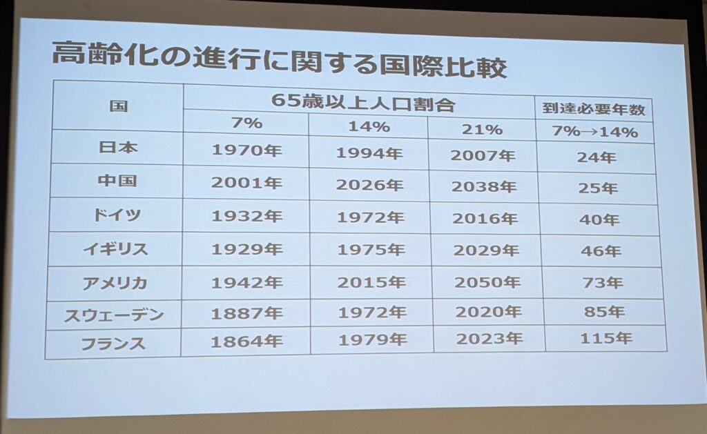 高齢化率そのものよりも、日本は諸外国に比べ例を見ないスピードで高齢化が進行していることが問題だ、との指摘がありました(対策が間に合わない)。