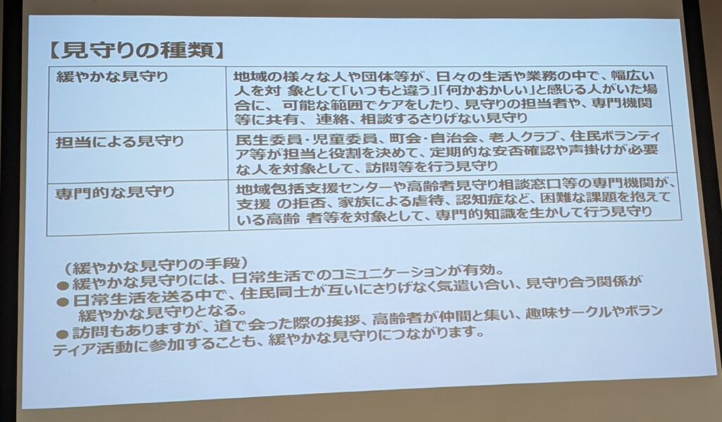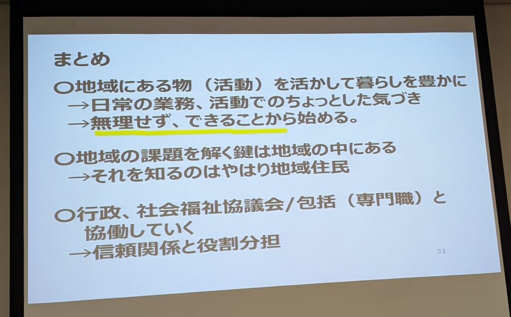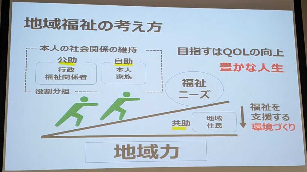 地域福祉の考え方として、「自助」、「公助」よりも「共助」が大切で、福祉を支援する環境づくり、地域力が大切だとされ、私が日頃から思っている「共助」の大切さを強調されました。