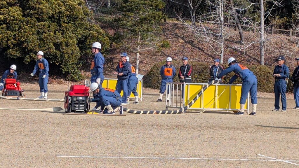 赤坂ファミリー公園で小型動力ポンプ、自動車ポンプの部14チームが、県大会代表を目指して日ごろの訓練成果を競いました。