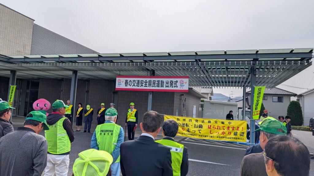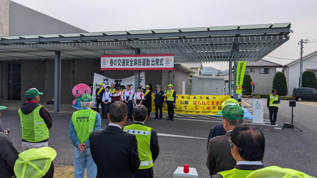 6日から15日までの春の交通安全県民運動の出発式が、赤磐市中央図書館駐車場で開かれました。